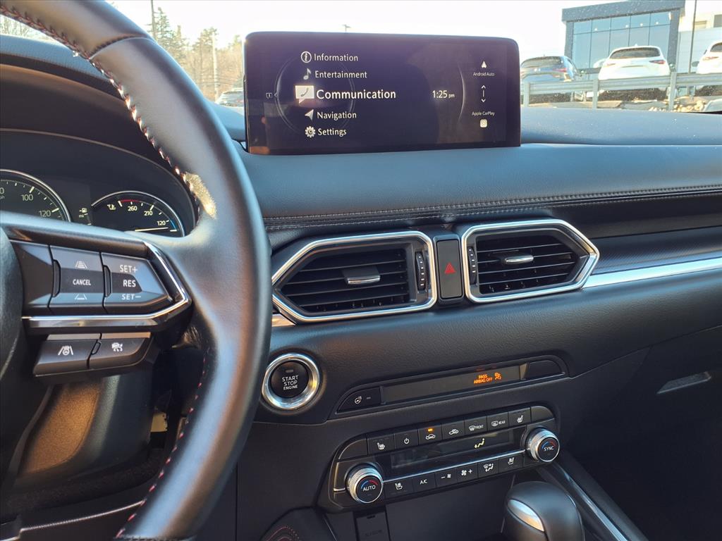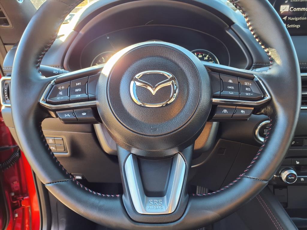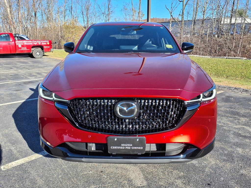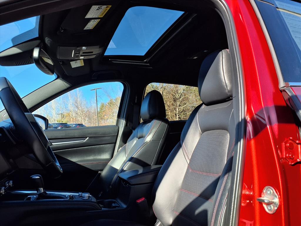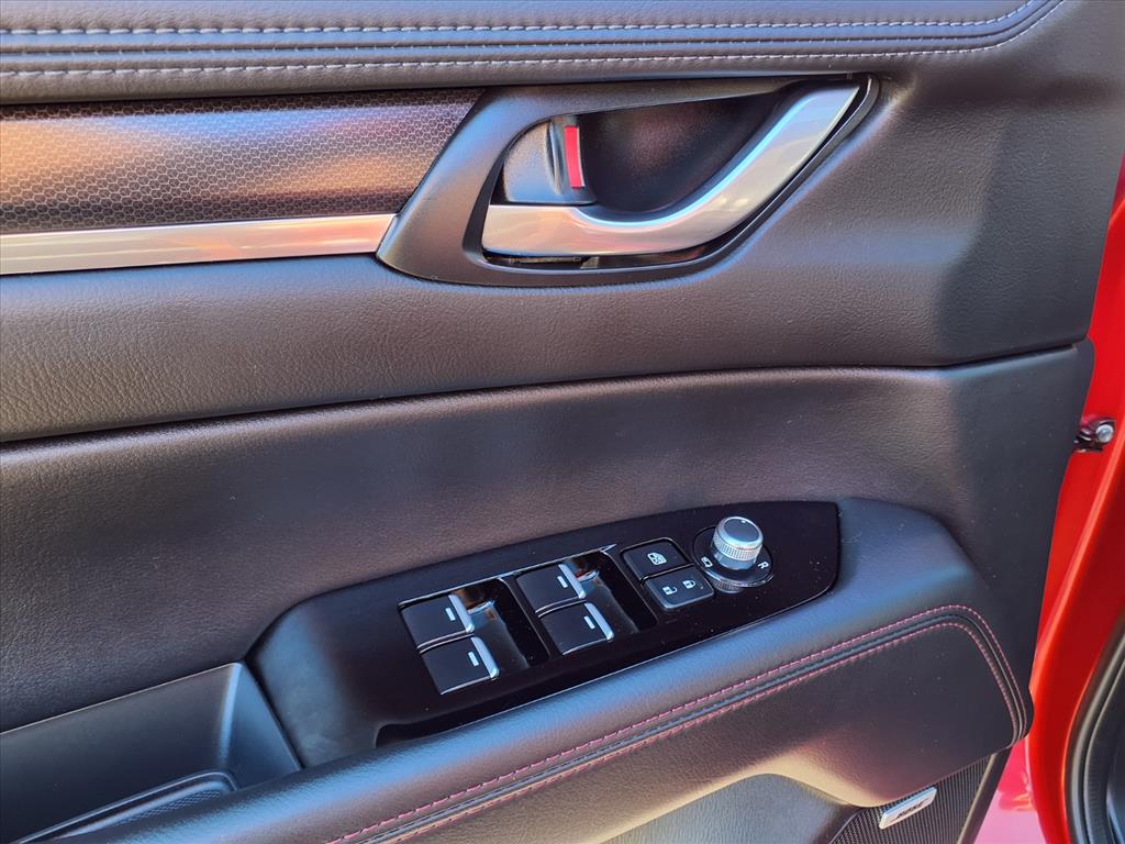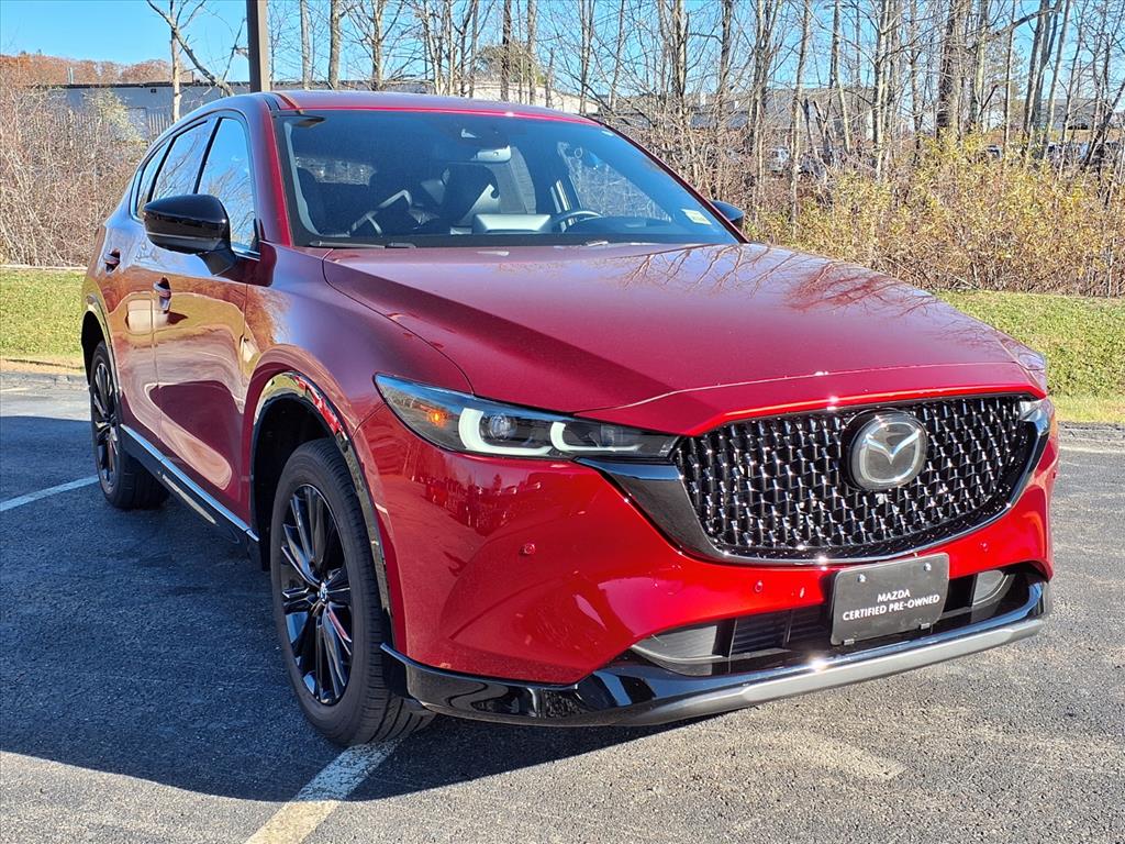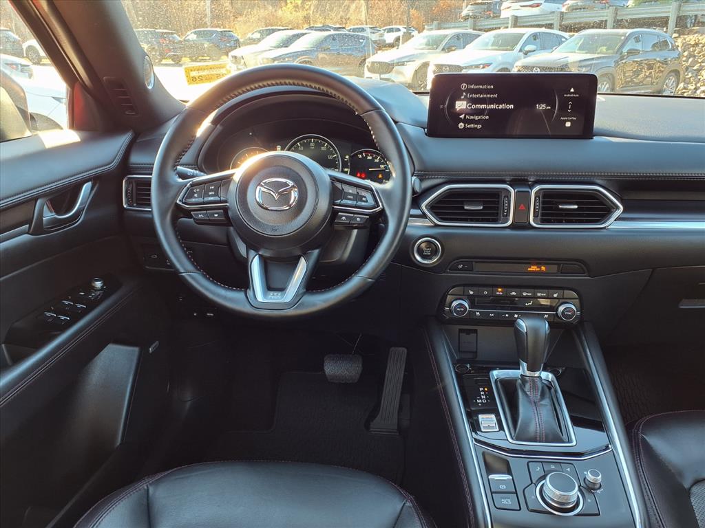Clean CARFAX. Certified. Soul Red Crystal Metallic 2025 Mazda CX-5 2.5 Turbo Premium AWD 6-Speed Automatic 2.5L I4 10 Speakers, 4-Wheel Disc Brakes, ABS brakes, Air Conditioning, All-Weather Floor Mats, Alloy wheels, AM/FM radio: SiriusXM, AppLink/Apple CarPlay and Android Auto, Auto High-beam Headlights, Auto-dimming Rear-View mirror, Automatic temperature control, Black Lug Nuts & Black Wheel Locks, Brake assist, Bumpers: body-color, Delay-off headlights, Driver door bin, Driver vanity mirror, Dual front impact airbags, Dual front side impact airbags, E911 Automatic Emergency Notification, Electronic Stability Control, Emergency communication system: MAZDA CONNECT, Four wheel independent suspension, Front anti-roll bar, Front Bucket Seats, Front Center Armrest w/Storage, Front dual zone A/C, Front reading lights, Fully automatic headlights, Garage door transmitter: HomeLink, Heads-Up Display, Heated door mirrors, Heated front seats, Heated rear seats, Heated steering wheel, Heated/Ventilated Front Bucket Seats, Illuminated entry, Infotainment System Voice Command, Interior Lighting Kit, Leather Seat Trim, Leather Shift Knob, Leather steering wheel, Low tire pressure warning, Memory seat, Multifunction Commander Control, Occupant sensing airbag, Outside temperature display, Overhead airbag, Overhead console, Pandora, Panic alarm, Passenger door bin, Passenger vanity mirror, Power door mirrors, Power driver seat, Power Liftgate, Power moonroof, Power passenger seat, Power steering, Power windows, Radio Broadcast Data System Program Information, Radio data system, Radio: AM/FM/HD Audio System, Rain sensing wipers, Rear anti-roll bar, Rear reading lights, Rear seat center armrest, Rear window defroster, Rear window wiper, Remote keyless entry, Retractable Cargo Cover, SMS Text Msg Audio Delivery & Reply, Soul Red Crystal Metallic Paint, Speed control, Speed-sensing steering, Split folding rear seat, Spoiler, Steering wheel mounted audio controls, Tachometer, Telescoping steering wheel, Tilt steering wheel, Traction control, Trip computer, Turn signal indicator mirrors, Variably intermittent wipers, Ventilated front seats, and Wheels: 19 x 7J Aluminum Alloy.